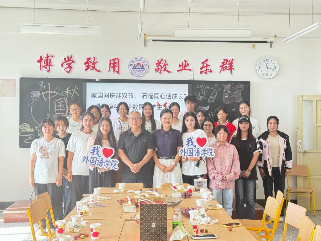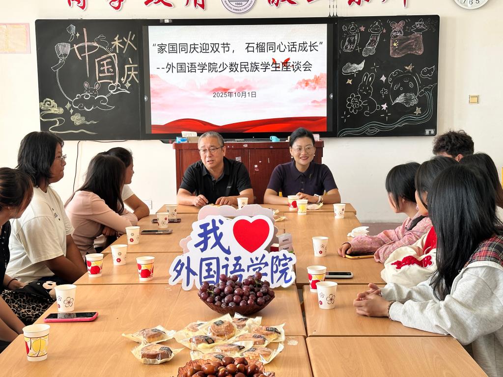 为迎国庆、庆中秋,深化民族团结教育,2025年10月1日,外国语学院举办“家国同庆迎双节,石榴同心话成长”少数民族学生座谈会。
