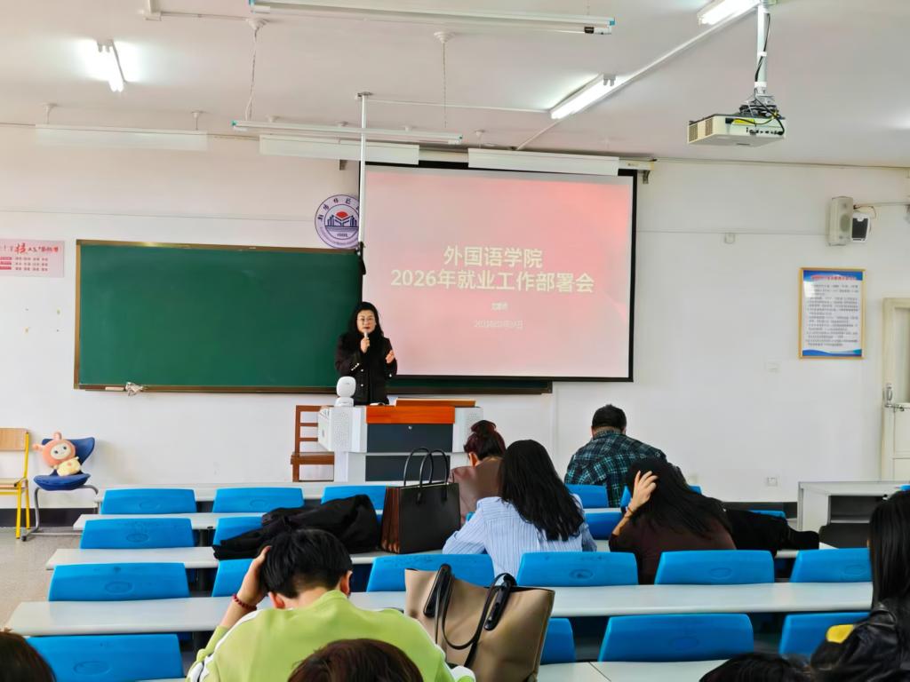 为切实压实就业工作责任,精准推进2026届毕业生高质量充分就业,3月25日,外国语学院在教学楼2合班403教室召开2026年就业工作部署会。学院党总支书记刘炜炜主持会议并讲话,全体教师参会。